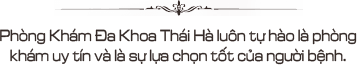 Phòng khám đa khoa Thái Hà được xây dựng và thành lập bởi ban lãnh đạo có tầm nhìn và đội ngũ y bác sĩ tâm huyết với nghề. Phòng khám luôn tự hào bởi sự nỗ lực phát triển không ngừng nhằm mang tới những điều kiện chẩn đoán và điều trị hiệu quả cao, không gian nghỉ ngơi, chờ khám thoải mái cho người bệnh. Phòng khám chuyên điều trị các bệnh về phụ khoa, nam khoa, bệnh xã hội, vô sinh hiếm muộn.